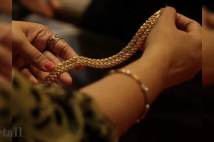 A customer holds a gold chain at a jewellery store in Mumbai, IndiaMumbai: India's gems and jewellery exports declined 35.23…