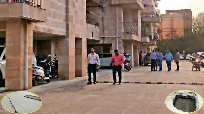 द्वारका की त्रिवेणी हाइट्स सोसायटी में फिर दहशत का माहौल है। टावर B के सामने फर्श में दरारें और सीवर मैनहोल के नीचे जमीन धंसने से लोग चिंतित हैं।