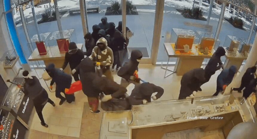 Around 25-30 masked thugs entered a jewelry store in California in broad daylight Monday afternoon, smashed and grabbed whatever they could and then shot fires as the automatic door of the store locked them in. The entire act of vandalism was caught on camera as while the store lost around $1 million in merchandise. The thugs used crowbars and pickaxes to smash the display cases and grab jewelry.Police said the heist was planned days in advance as the suspects arrived in sex separate vehicles and parked their cars in the valet area 100 feet from the store entrance. A similar robbery took place in the same store in 2023 following which the owners installed an automatic door which locked the thugs inside but they shot their way out.