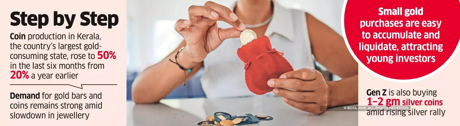 Manufacturers in Kerala, the country’s largest gold-consuming state, said gold coin production has jumped to 50% in the past six months, from 20% a year earlier, with demand for 100 milligram or 0.1 gm coins accelerating since Diwali, said James Jose, managing director, CGR Metalloys, a gold refiner and bullion manufacturing firm.