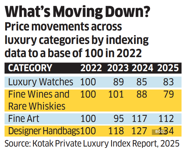 “Luxury watches and fine wines are largely traded through open international secondary markets where prices reflect global demand and sentiment rather than solely Indian sentiment,” says a spokesperson of Kotak Private Banking in a response to ET. “Post-pandemic market normalisation, following a supply-squeeze boom during the pandemic, is a key driver for the declining growth of these markets.”