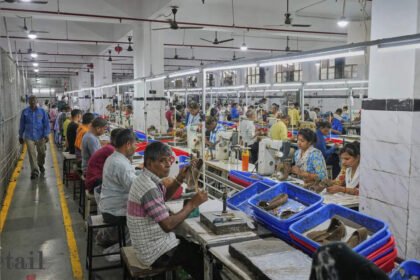 Workers in a manufacturing unit make leather footwear in Agra, India, Monday,…