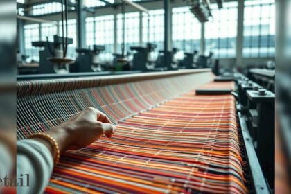 My hands meticulously operate an industrial loom, weaving vibrant threads. Advanced machinery hums in the background, bathed in soft light.…