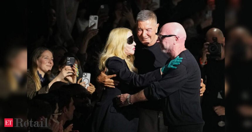 FILE -Madonna congratulates Domenico Dolce, right, and Stefano Gabbana at the end of the Dolce & Gabbana Fall/Winter 2026-2027 Womens collection, presented in Milan, Italy, Feb. 28, 2026. (AP Photo/Antonio Calanni), File)
