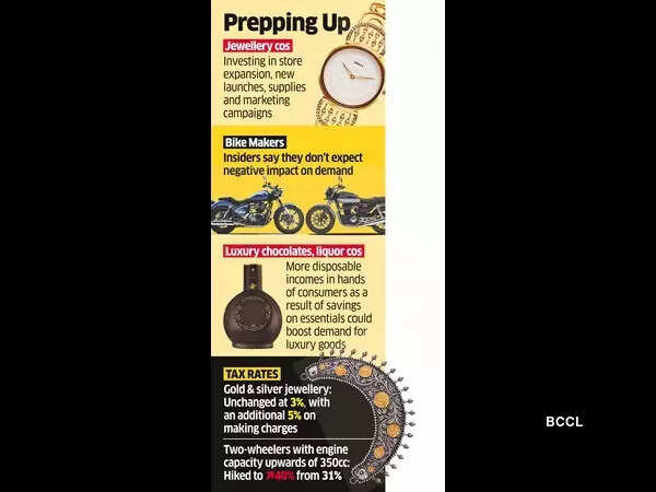 Makers of luxury goods, jewellery, high-end bikes and premium chocolates, which will attract the same or slightly higher goods and service tax rates, are increasing retail stocks and lining up new launches and campaigns, betting on ripple effects of the widespread GST cuts.