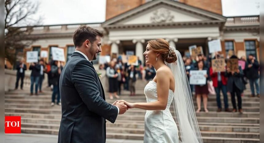 In midtown Manhattan, a Queens couple proved that not even the roar of a protest could overshadow their wedding day.Nicole and Richard Uraga, both 30, tied the knot at the main branch of the New York Public Library in Bryant Park, entering the iconic building just before over 700 pro-Palestine protesters gathered with signs, loud music and bombastic political chants. “When we came out, the whole protest was going on and they were banging and screaming up,” said Nicole. “But nothing can stop love,” the groom told The New York Post.The Uragas entered the building, exchanged their “I do’s” and reemerged outside as husband and wife into a dense and rowdy anti-Israel crowd swarming the entrance of the library. As the newlyweds took pictures near the steps celebrating their union, the protesters chanted “From the River to the Sea” and banged pots, pans and metal bowls. However, the demonstrators’ shrill shrieks could not disturb their newly minted marital bliss. “We did not let the protest get in the way of our marriage,” Nicole said. “It’s a day we’ve planned and we’ve hired a photographer and officiant and it’s a day that means something to us, August 16. So we decided to keep going on with our ceremony,” she added. The couple have been together for over 11 years and secured this date four months in advance. Regarding the protest, the bride’s mother Nancy Cando told The Post, “I pray for peace.”