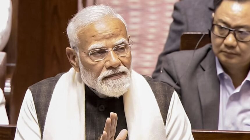 PM Narendra Modi replies to the Motion of Thanks to the President’s address in the Rajya Sabha during the Budget session of Parliament, in New Delhi on February 5, 2026. (Image: Sansad TV/PTI)