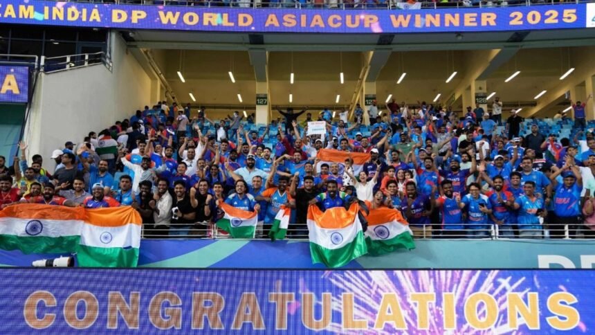 Fans celebrate after India won the Asia Cup cricket final against Pakistan at Dubai International Cricket Stadium, UAE, on September 28. (Image: AP/Altaf Qadri)