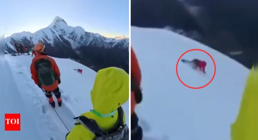 A tourist died while attempting to take a selfie on Mount Nama in Sichuan province, China. The man, identified as Hong, was part of a hiking group when the accident occurred on September 25.31-year-old Hong unclipped his safety harness to take a photo on the snowy mountaintop, reports the Mirror. He slipped near a crevasse and fell 200 metres (650 feet) down the mountain. Fellow climbers watched in horror as he scrambled to regain control but could not stop his fall. Footage shared on social media shows the moment he tumbled down the 5,588-metre peak.Emergency services rushed to the scene, but Hong was pronounced dead. His body was transported to Gongga Mountain Town. His cousin said it was his first attempt to hike the mountain.Officials from the Kangding municipal education and sports bureau said the group had not reported their plans or obtained climbing permits. A local official said, “If the crampons had not been removed and the rope had not been undone, this might not have happened.” Personnel from the Sichuan Mountaineering Association confirmed that Hong was not a professional. Police are investigating the incident.