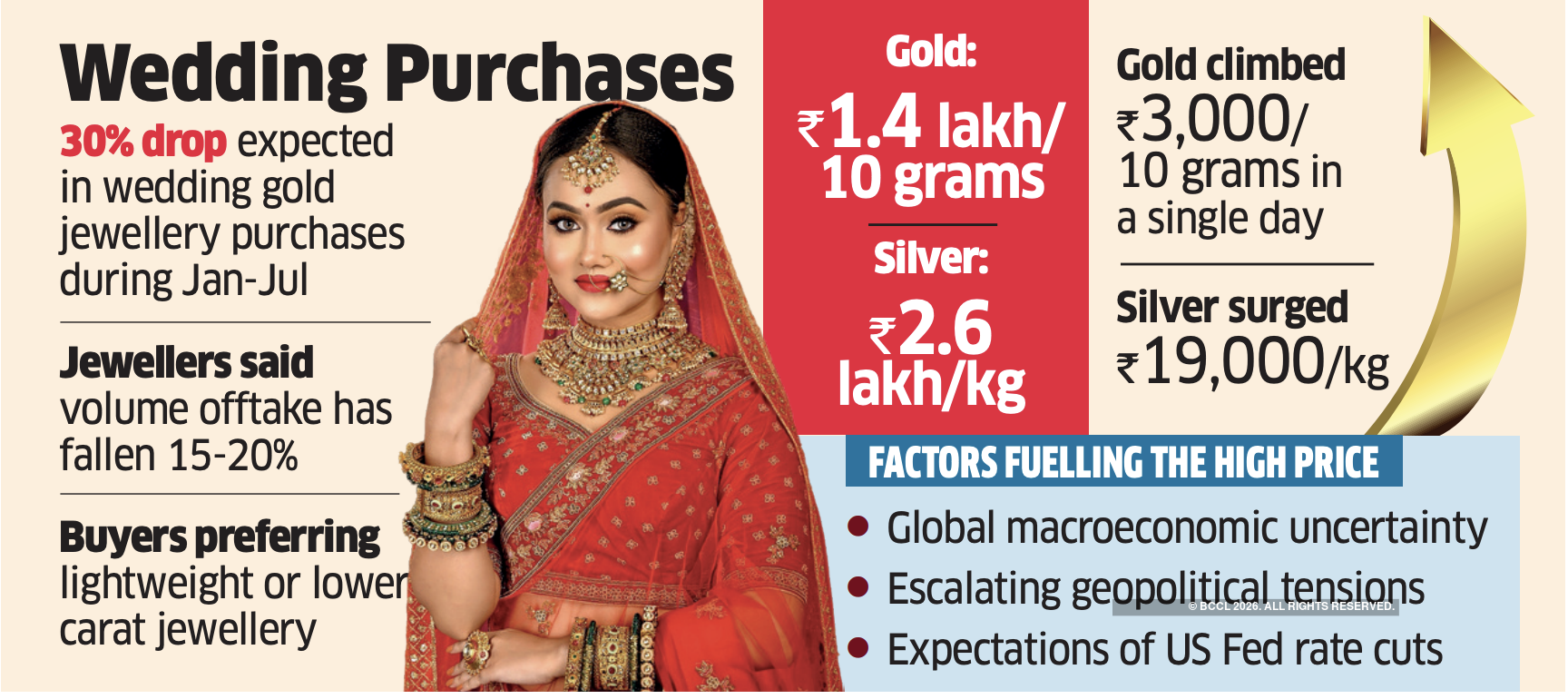 Gold was trading at ₹1.4 lakh per 10 grams and silver at ₹2.6 lakh per kg. At such elevated levels, the industry is expecting a 30% drop in wedding-related gold jewellery purchases between January and July compared with a year earlier.